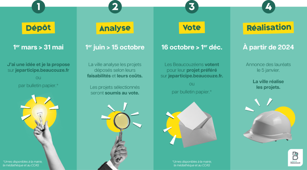 Le budget participatif est un outil du dialogue citoyen qui vise à instaurer plus de démocratie dans la vie politique locale et plus de participation citoyenne. Une enveloppe de 50 000€ sera confiée aux Beaucouzéens pour mettre en place leurs idées.