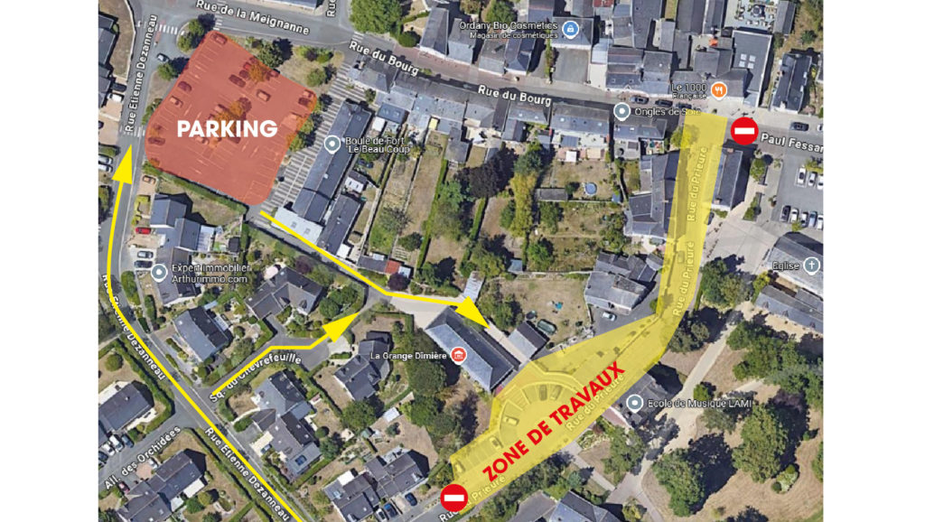 Pendant toute la durée des travaux (17 novembre 2025 au 28 février 2026), la rue du Prieuré sera fermée mais les expositions à la Grange Dîmière sont maintenues. L’accès en voiture se fera par le parking E. Dezanneau et à pied par l’allée des Frères Macé (80 mètres).