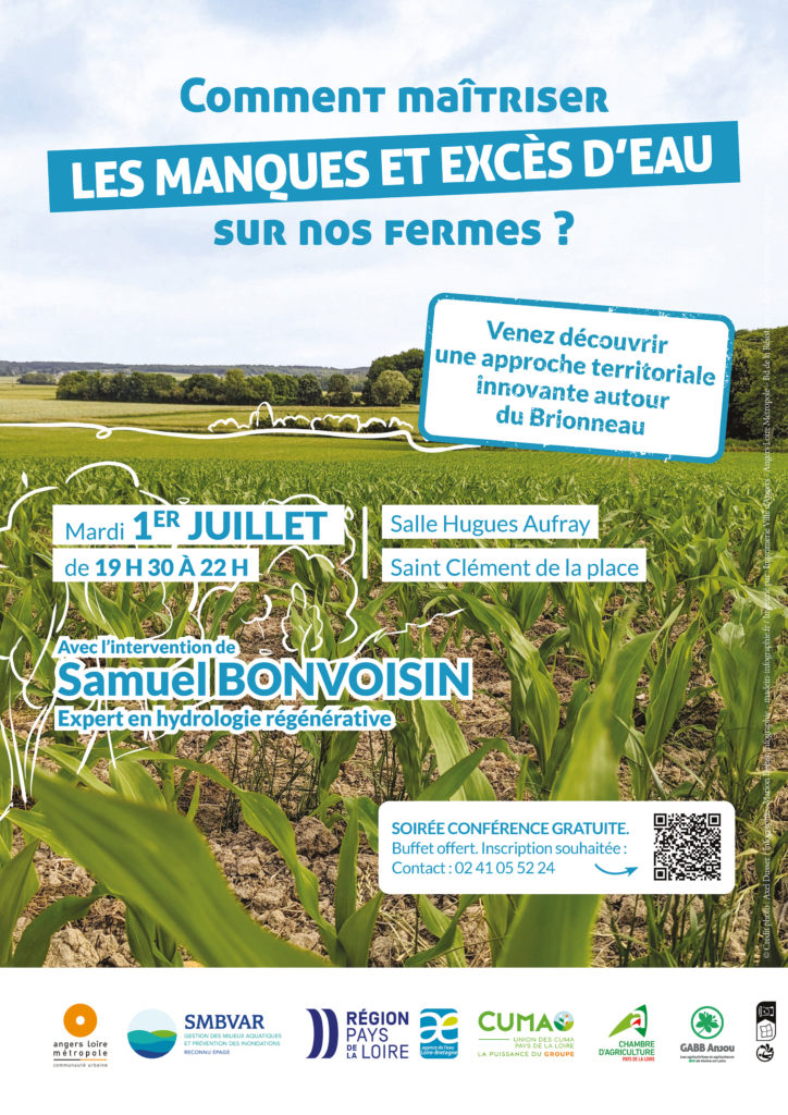 Ainsi, nous vous invitons à découvrir ce projet le 1er juillet 2025 à Saint-Clément-de-la-Place (Salle Hugues Aufray) lors d’une conférence intitulée « Et si on pouvait maîtriser les manques et excès d’eau sur nos fermes ? ». Venez vous informer, poser vos questions et rejoindre cette démarche entièrement prise en charge.