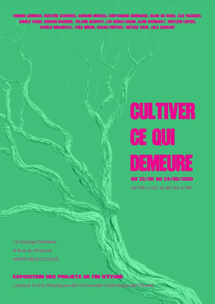 Les étudiants de la licence 3 Arts Plastiques de l’Université Catholique de l’Ouest vous présentent leur projet de fin d’études intitulé Cultiver ce qui demeure à la Grange Dimière à Beaucouzé, du 22 mai au 24 mai 2026.