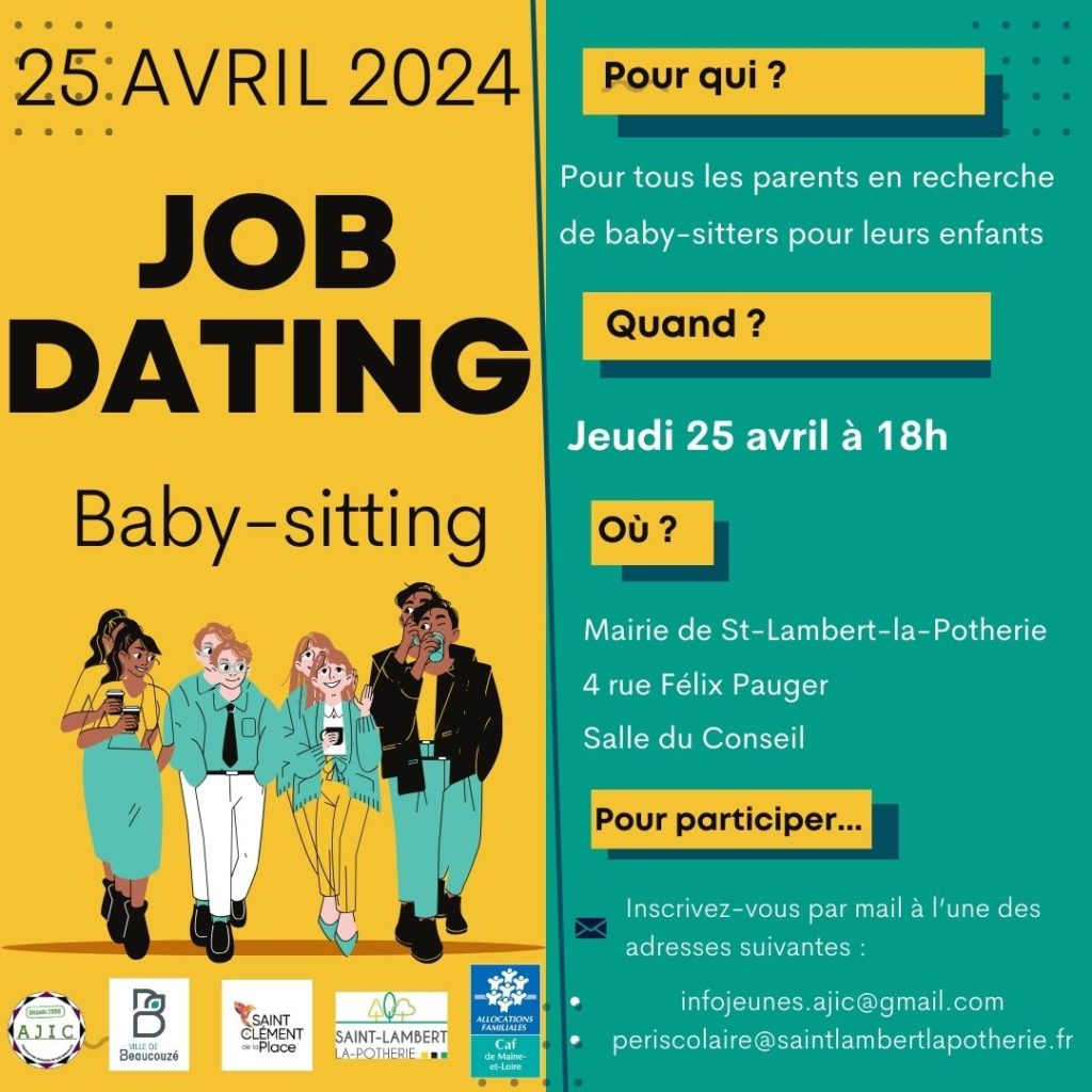 A l’issue des trois jours de formation de babysitting le 23,24 et 25 avril, un job dating est organisé pour les familles qui sont en recherche de baby-sitters. Il aura lieu dans les locaux de la mairie à St-Lambert-la-Potherie à partir de 18h. Ce sera l’occasion de rencontrer individuellement les jeunes diplômés et de prendre des contacts !